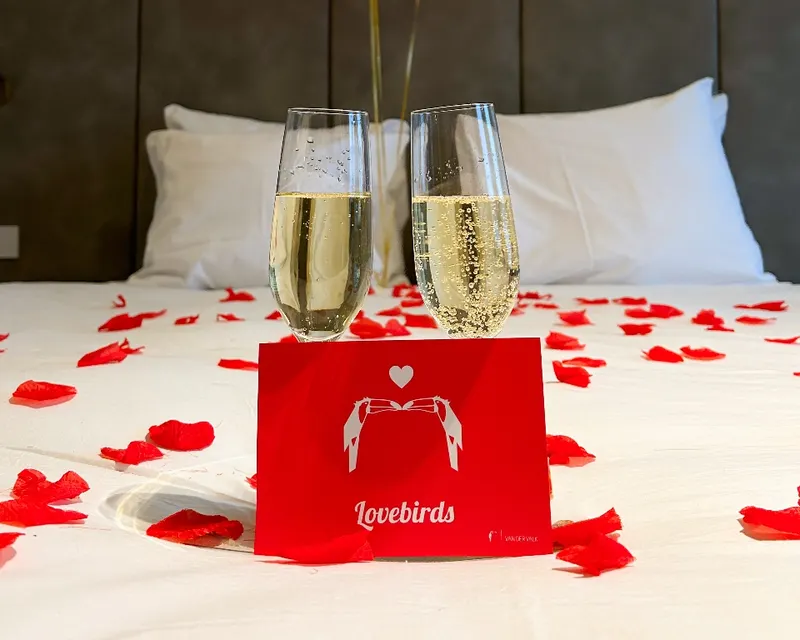 Jullie overnachten in een Deluxe kamer. De kamer wordt prachtig versierd in een romantische sfeer. De versiering bestaat uit rozenblaadjes, ballonnen en een kaartje. Daarnaast staat er op de kamer een flesje Cava voor jullie klaar. Zo kunnen jullie samen proosten op de liefde. De kamer straalt rust uit en is stijlvol ingericht met lichte kleuren. Dankzij de ramen is er veel natuurlijk licht op de kamer. De kamer beschikt over een kingsize bed voor een heerlijke nachtrust, koffie- en theefaciliteiten, een minibar en gratis wifi. De SMART-televisie met Chromecast is ideaal om te dag af te sluiten met jullie favoriete film of serie. Ook de badkamer is van alle gemakken voorzien. De badkamer beschikt over een regendouche of groot ligbad, een ruime wastafel met spiegels en een apart toilet.