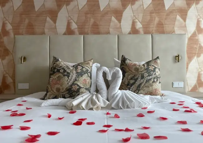 Ons Romantisch pakket Deluxe bestaat uit rozenblaadjes, gevouwen zwaantjes, 'love birds' kaartje en een fles wijn (wit of rood).